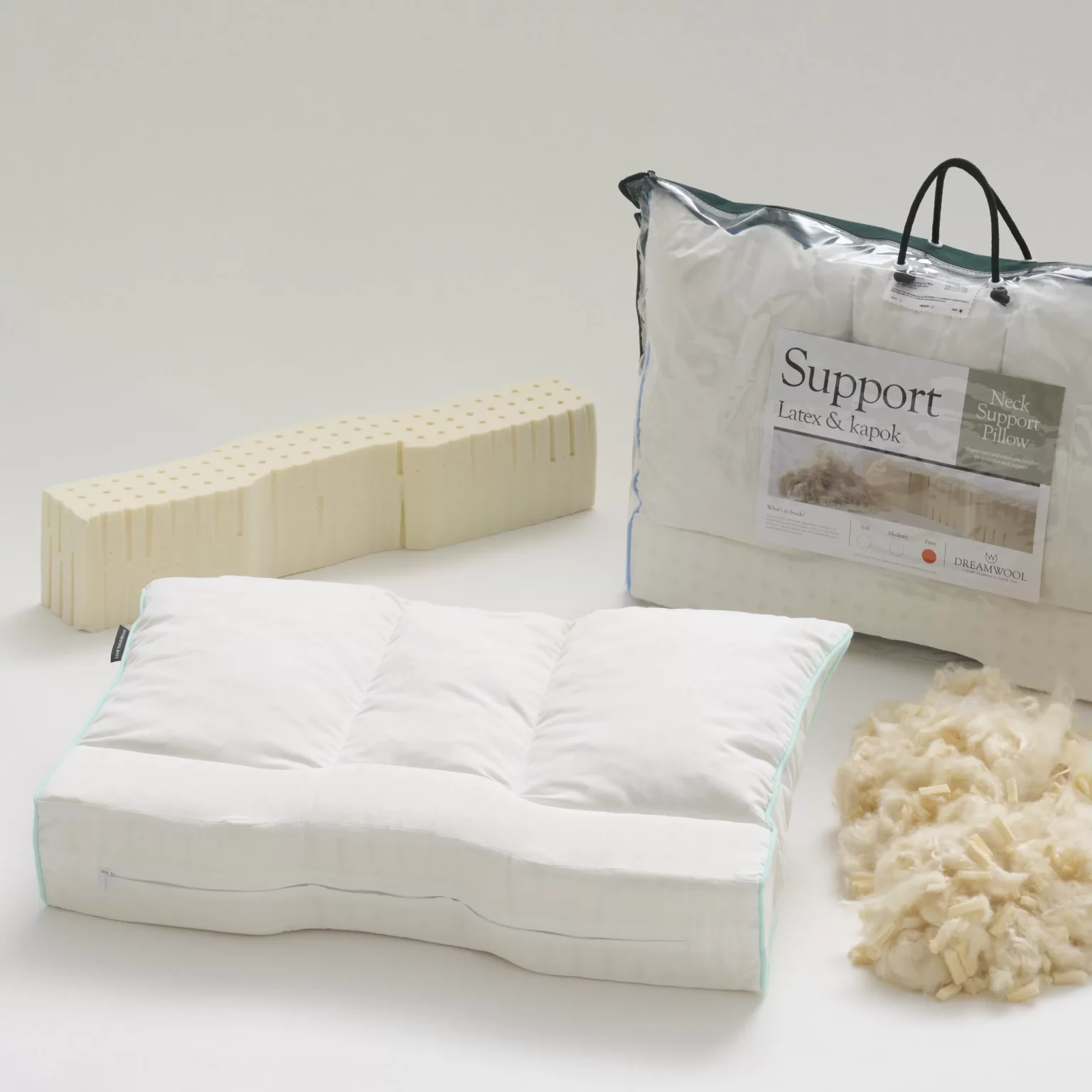 Neck Support Pillow – Shaped latex for proactive neck support all night (soft, medium or firm density), this customizable style has three adjustable chambers of kapok filling and latex fingers. Paired with 100% natural latex, the soft, silky fibres of the tropical kapok tree are the perfect plant-based alternative to down.